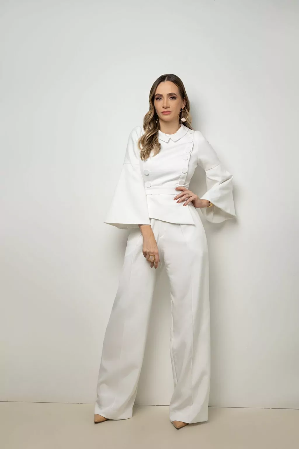 A calça pantalona é forrada e conta com um friso que alonga a silhueta, além de cós com botões forrados e regulagem interna na parte traseira, garantindo um ajuste perfeito e conforto ao longo do dia.