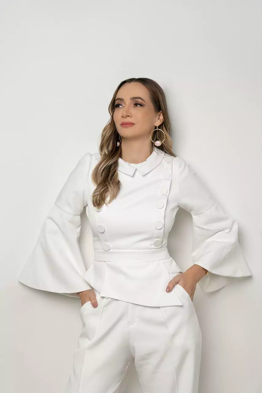 A blusa apresenta detalhes assimétricos na cintura, acompanhada de um cinto anatômico que valoriza a silhueta. Os botões forrados na parte frontal e o decote redondo com gola adicionam um toque de sofisticação. As mangas longas possuem recortes e detalhes em mangas flare, proporcionando um visual contemporâneo e estiloso.