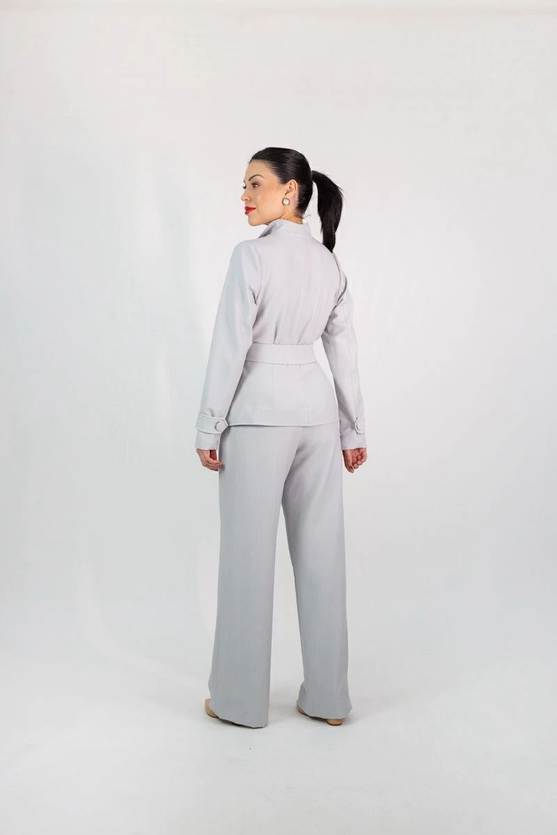 A camisa de gola diferenciada, construída em três pontos arquitetônicos, cria um foco estratégico no colo. Com modelagem precisa, manga longa e acabamento impecável, ela equilibra força e sofisticação. O look é finalizado com um cinto com fivela, que marca a cintura e assina o conjunto com presença.
