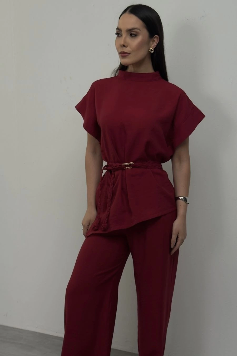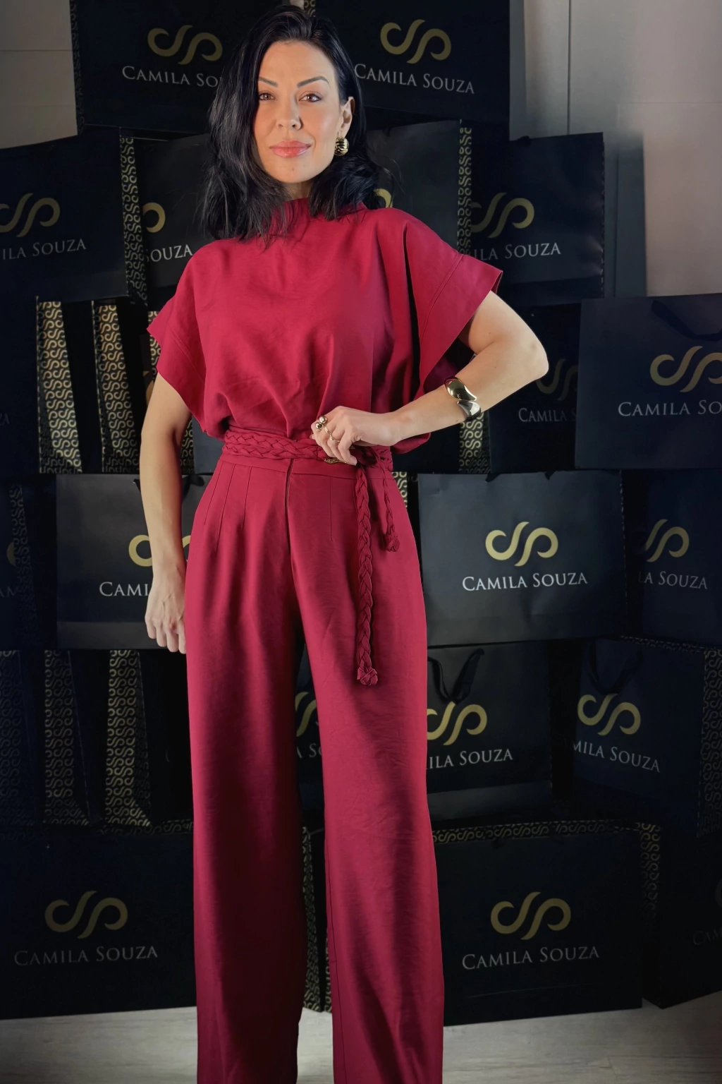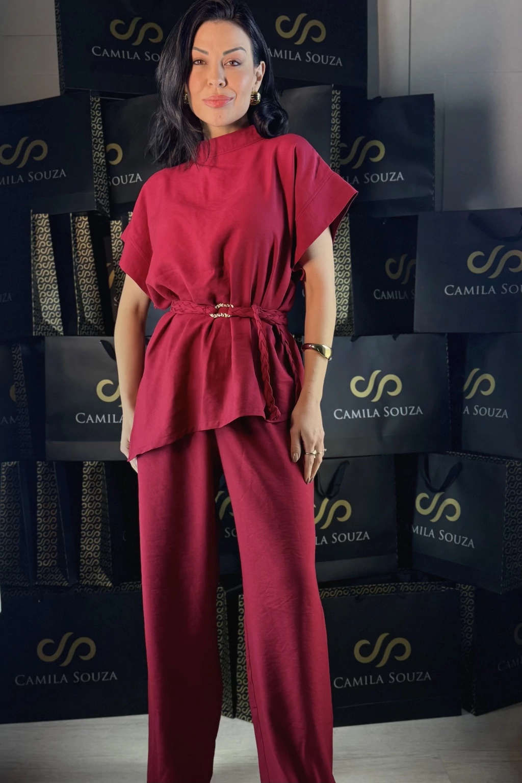 A blusa ampla e simétrica traz uma gola arquitetônica que valoriza o colo, acompanhada de mangas estruturadas, criando um visual contemporâneo e leve. Para finalizar, o look é assinado com um cinto trançado com detalhe dourado orgânico, que adiciona personalidade e sofisticação ao conjunto.
