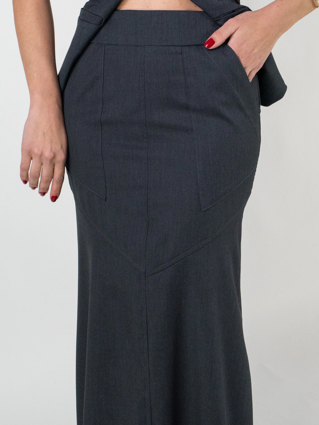 Saia longa na elegante cor chumbo, confeccionada em tecido de alfaiataria diferenciado. Os recortes desenvolvidos frontais são estrategicamente posicionados para alongar as pernas e fornecem uma orientação de silhueta, trazendo uma imagem de poder. Inspirada no arquétipo do governante, uma peça que combina sofisticação com modernidade.
